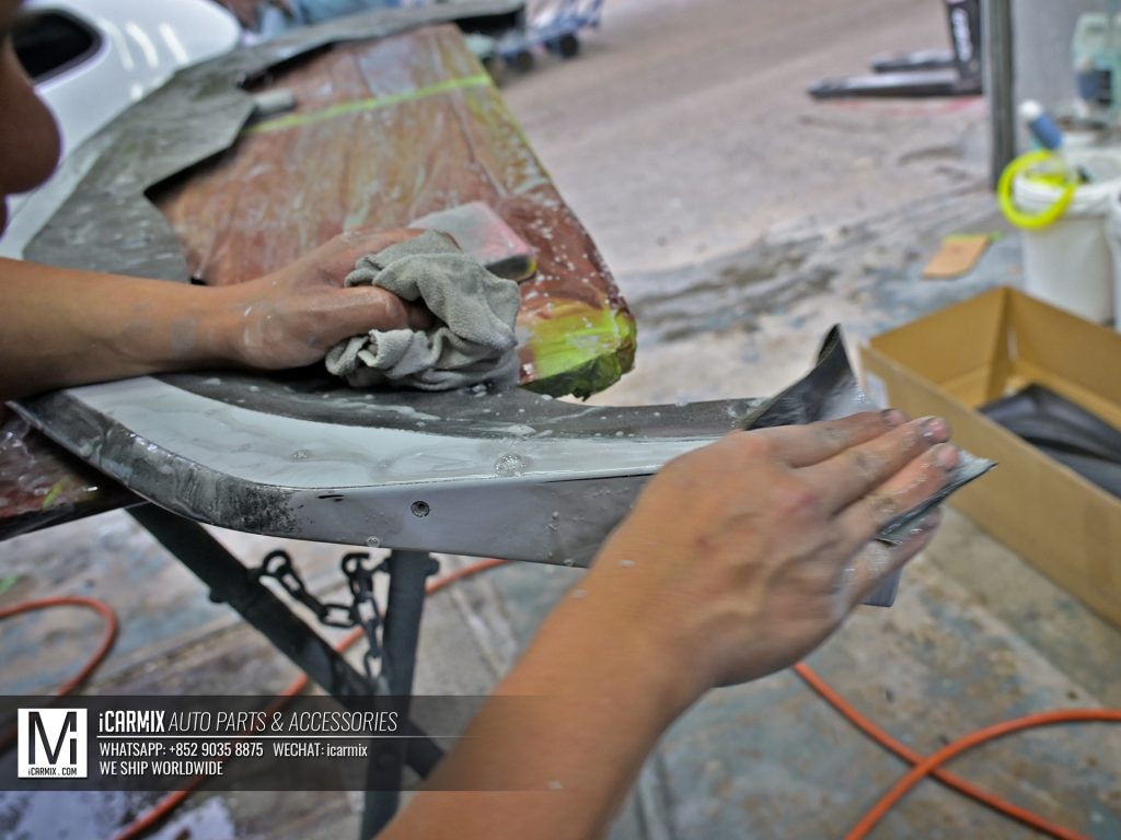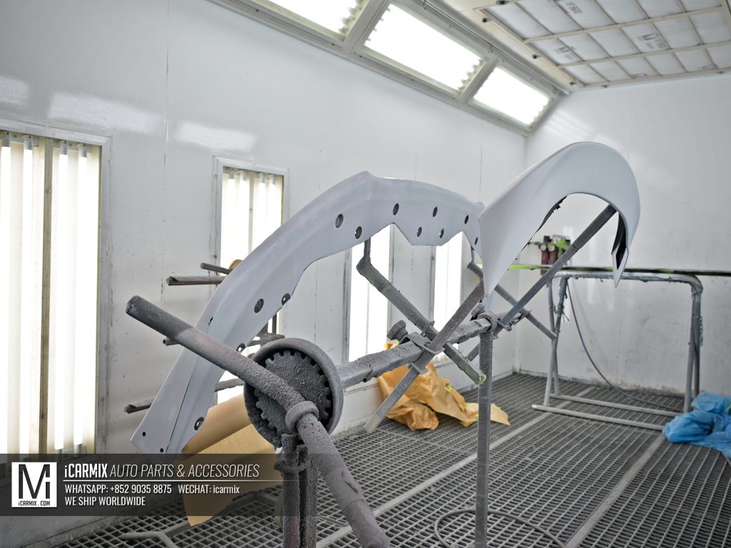 ▲在正式焗油前,師傅會為新頭唇、側裙組件、尾翼等進行研磨、上底漆、再研磨、除油等等的事前處理。